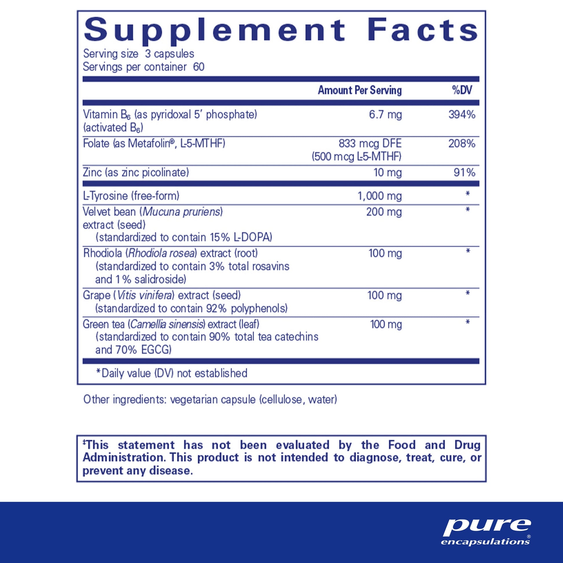 The supplement contains complementary ingredients that support natural dopamine production such as vitamin B6, Metafolin® folate, zinc and velvet bean extract. Other ingredients include rhodiola, green tea and grape seed.‡