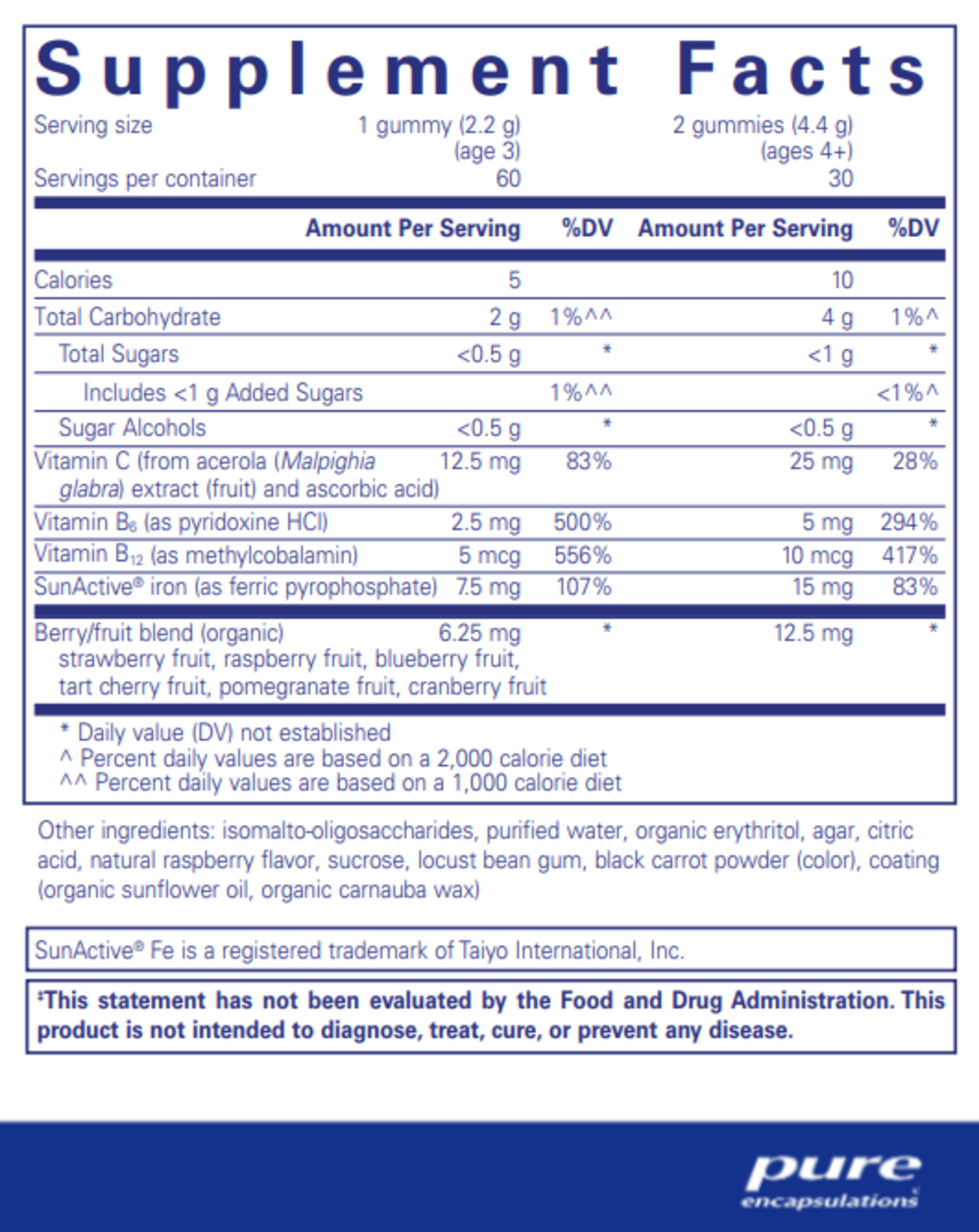 Our Iron-C+ Gummy offers a tasty, convenient way to support healthy iron level with a blend of bioavailable iron, vitamin C and B vitamins. This raspberry-flavored vegan gummy, also provides vitamin C to enhance iron absorption. We've also added vitamins B6 and B12 to offer additional support for healthy red blood cell function.‡
