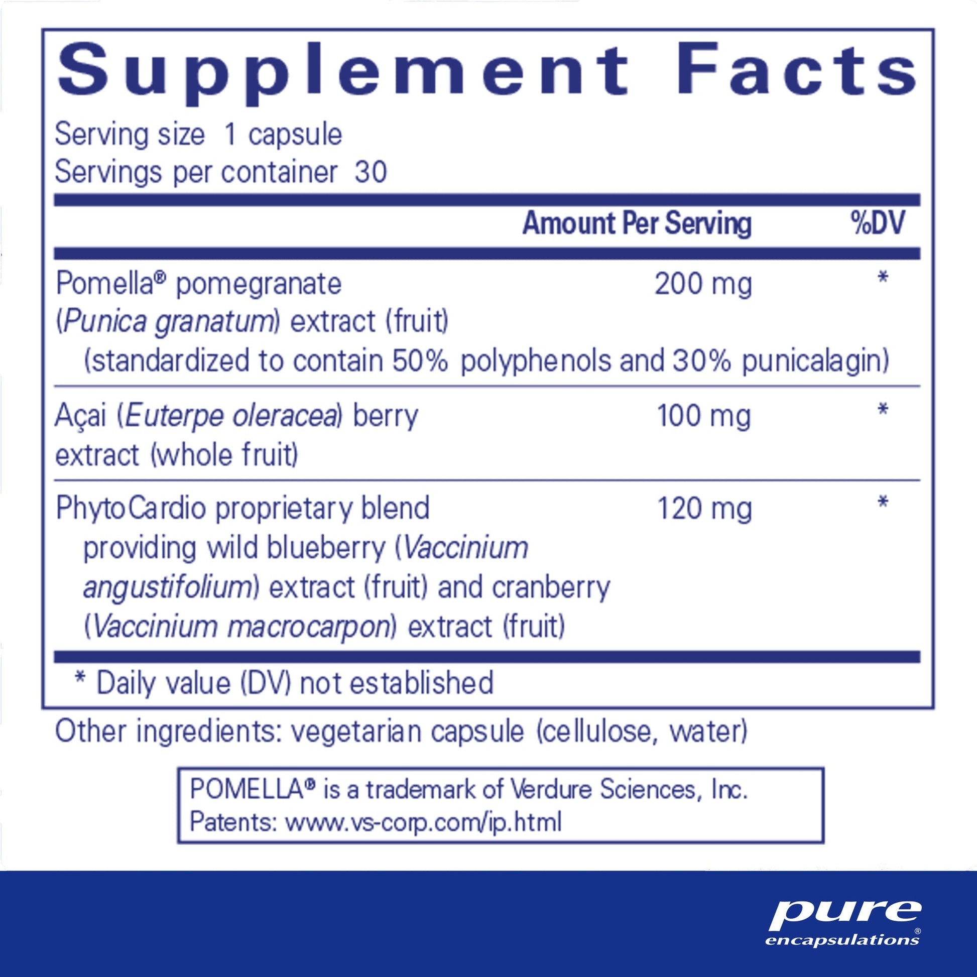 Pomegranate also supports vascular function, healthy blood flow and cardiovascular health. The ingredient PhytoCardio® provides fruit extracts from cranberry and wild blueberry. Dietary intake of these fruits has been associated with healthy blood vessel function and gene expression. Also included in this supplement is the acai berry of Brazil, where it is known as “the fruit of life.” Acai is rich in anthocyanins, vitamins, minerals, amino acids and essential fatty acids.