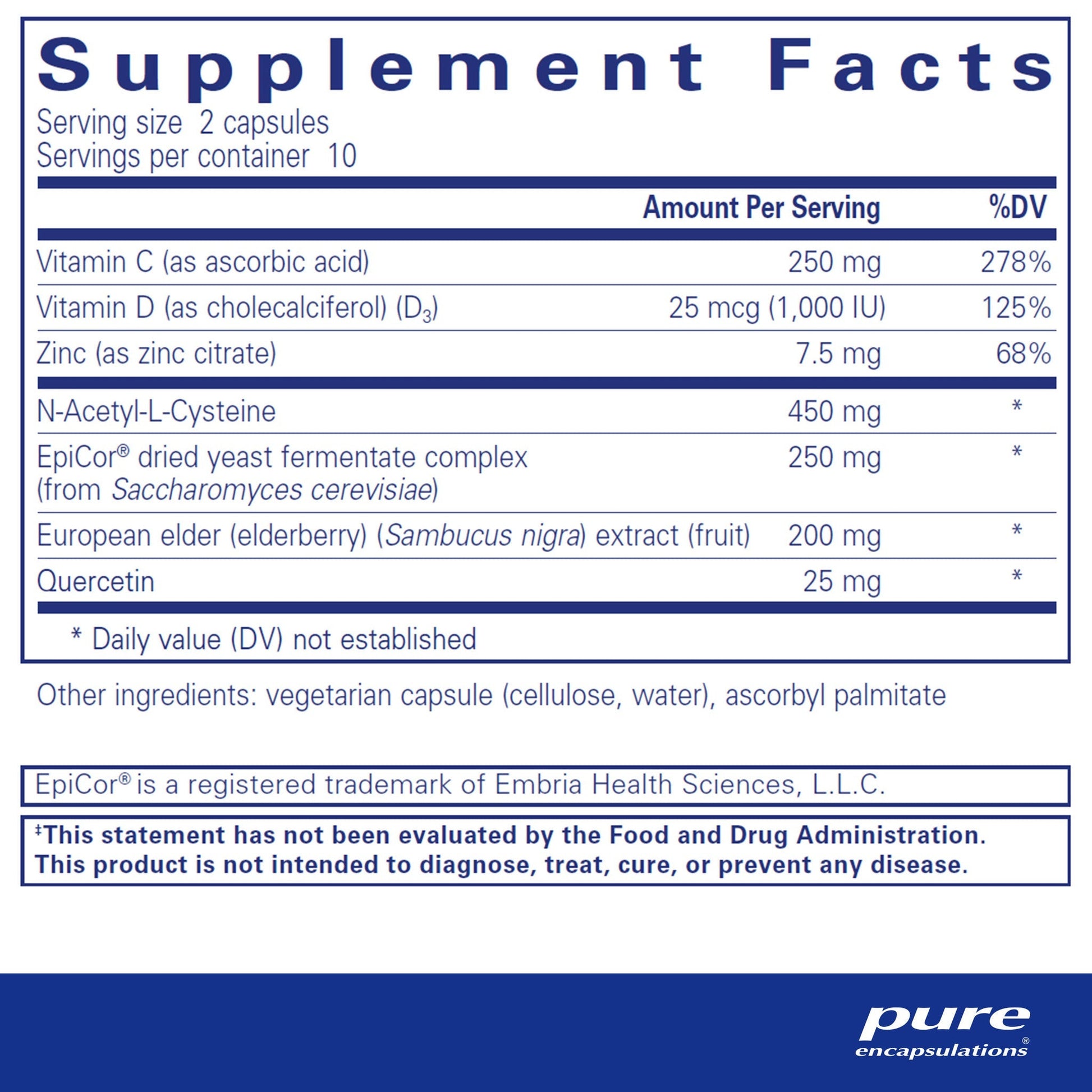 We designed this travel supplement with a complex called EpiCor® since it may enhance immune cell production. We also included NAC for antioxidant protection and healthy respiratory function. Additional ingredients like quercetin and elderberry provide flavonoids for immune and respiratory function, while vitamin C, D and zinc play important roles in immune cell activation.‡