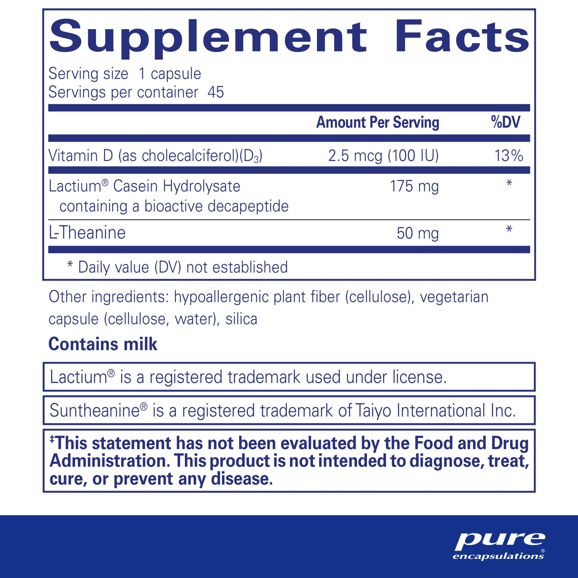 This supplement includes Lactium®, a clinically researched, ingredient called a bioactive casein decapeptide. It was developed to target stress-related symptoms. Also included in the formula is theanine which helps to calm the sympathetic nervous system for a relaxing effect without drowsiness. Theanine also helps maintain healthy IgA levels, suggesting support for immune health during occasional stress.‡
