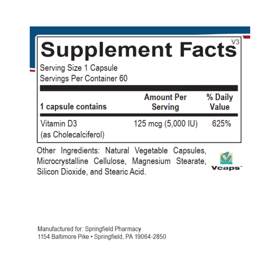 SP Vit D3 5000 formula is delivered as D3 (cholecalciferol) for optimal use by the body, and is available in 5000 IU capsules to meet a variety of individual needs.
