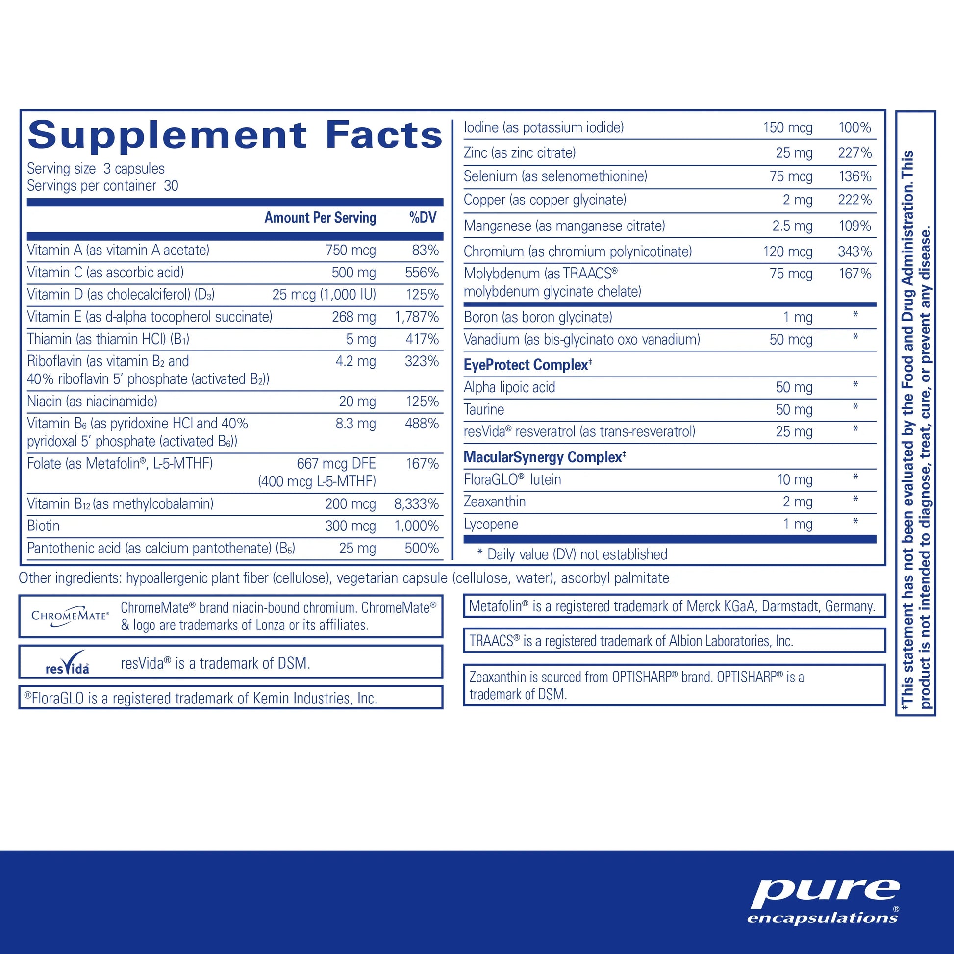 In this formula, with a convenient, three capsule per day dosing, we use clinically researched levels of vitamin C, vitamin E, zinc and copper in highly bioavailable forms to support healthy vision and eye integrity. The formula includes vitamin A to support night vision and healthy tear production. It also supports visual function with ingredients such as taurine, alpha lipoic acid and resveratrol. To maintain macular and retinal health, the formula includes lutein, zeaxanthin and lycopene.