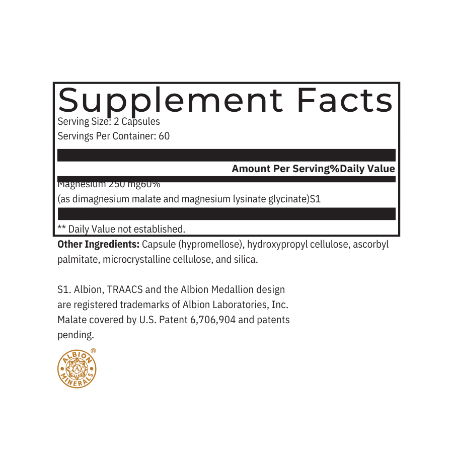 VitaMag Ultra contains Albion®’s TRAACS® magnesium lysinate glycinate (mineral amino acid chelate) and Albion’s chelated dimagnesium malate—both formulated for enhanced absorption. Malic acid (from di-magnesium malate) supports energy production and lactic acid clearance via the Krebs cycle. Malic acid may also support antioxidant systems by enhancing glutathione and antioxidant enzymes.