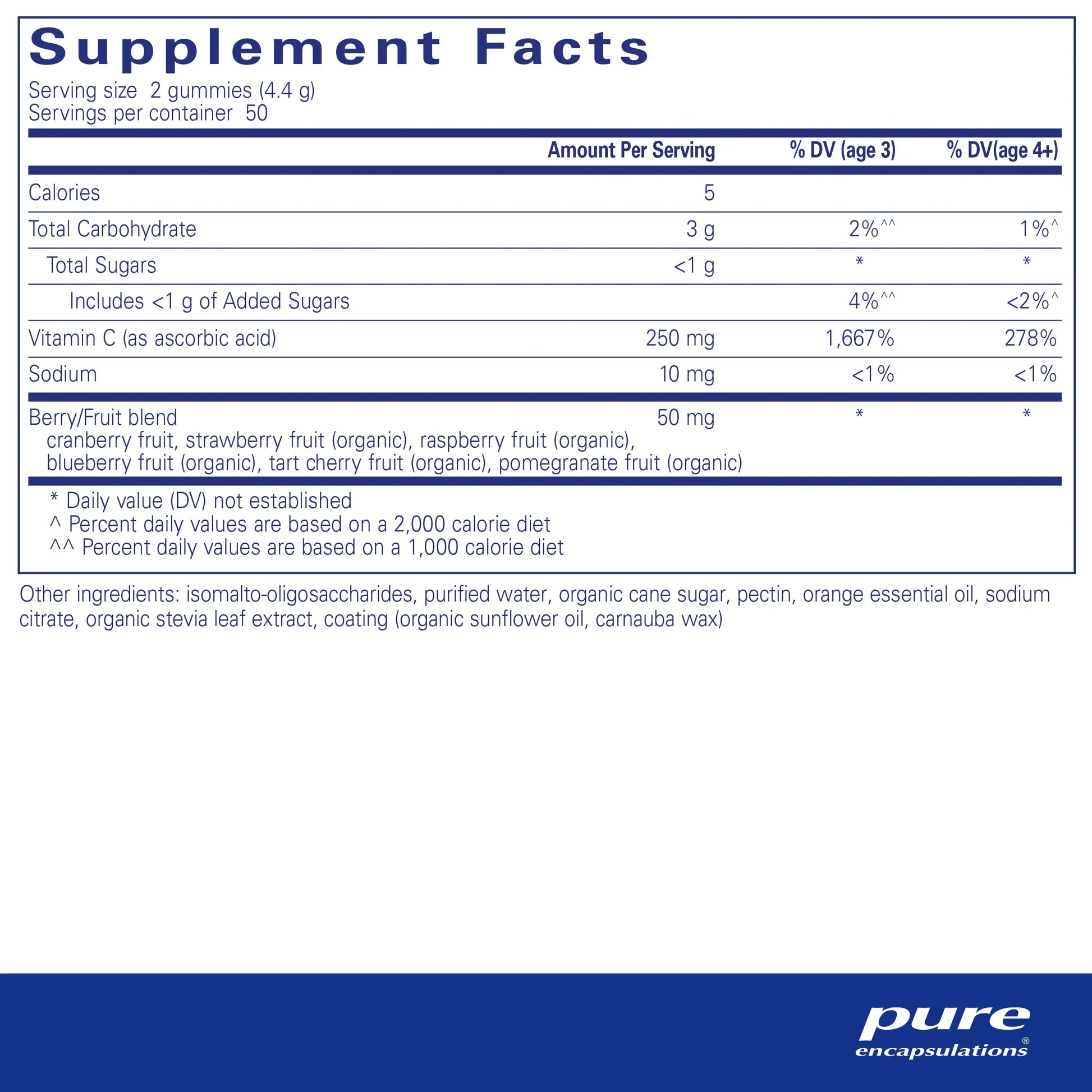 We designed this power vitamin in a great-tasting, sour orange-flavored gummy that’s lightly sweetened with prebiotic fiber, cane sugar and stevia. The formula includes an organic Berry/Fruit blend.