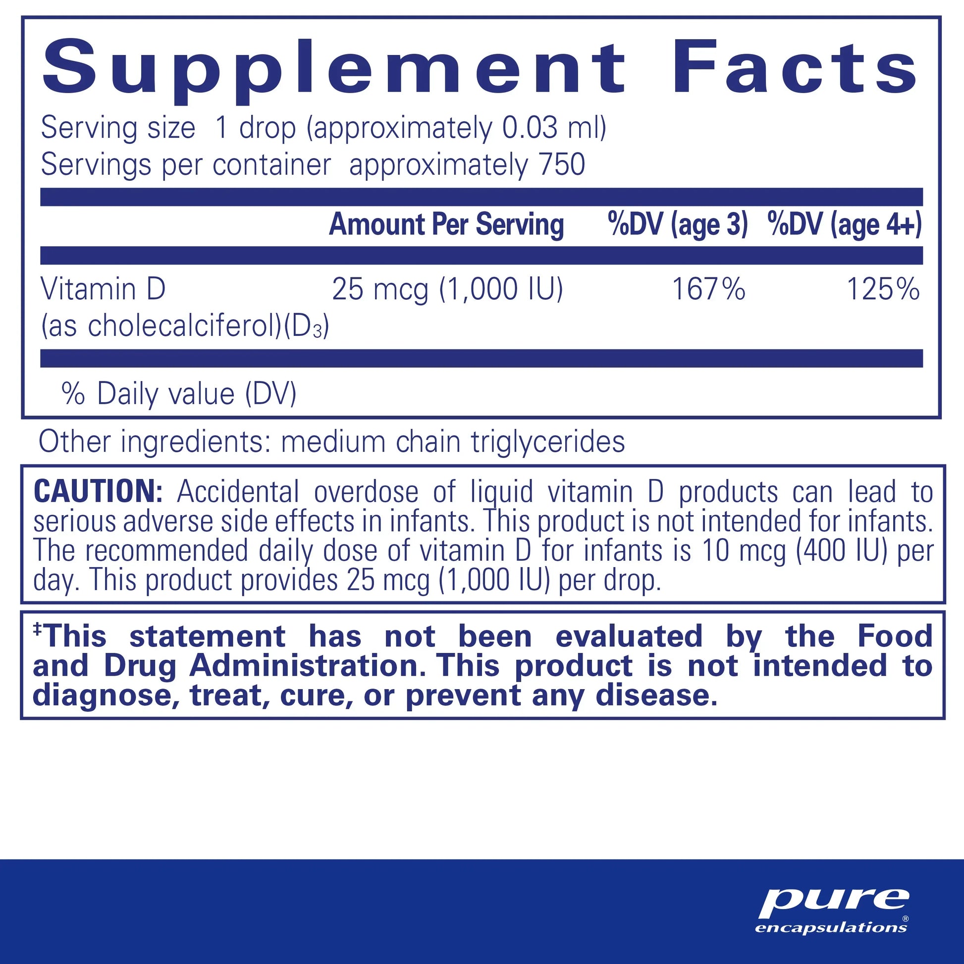 This liquid form of Vitamin D3 comes in a base of medium-chain triglycerides to support absorption. One drop provides 25 mcg (1,000 IU); for individuals with greater short-term needs, this product allows for taking 625-1,250 mcg (25,000- 50,000 IU) of vitamin D3 per week—without having to take multiple capsules. For the elderly, Vitamin D3 liquid is an easy-to-use form. It’s offered with a child-proof cap for improved safety.‡